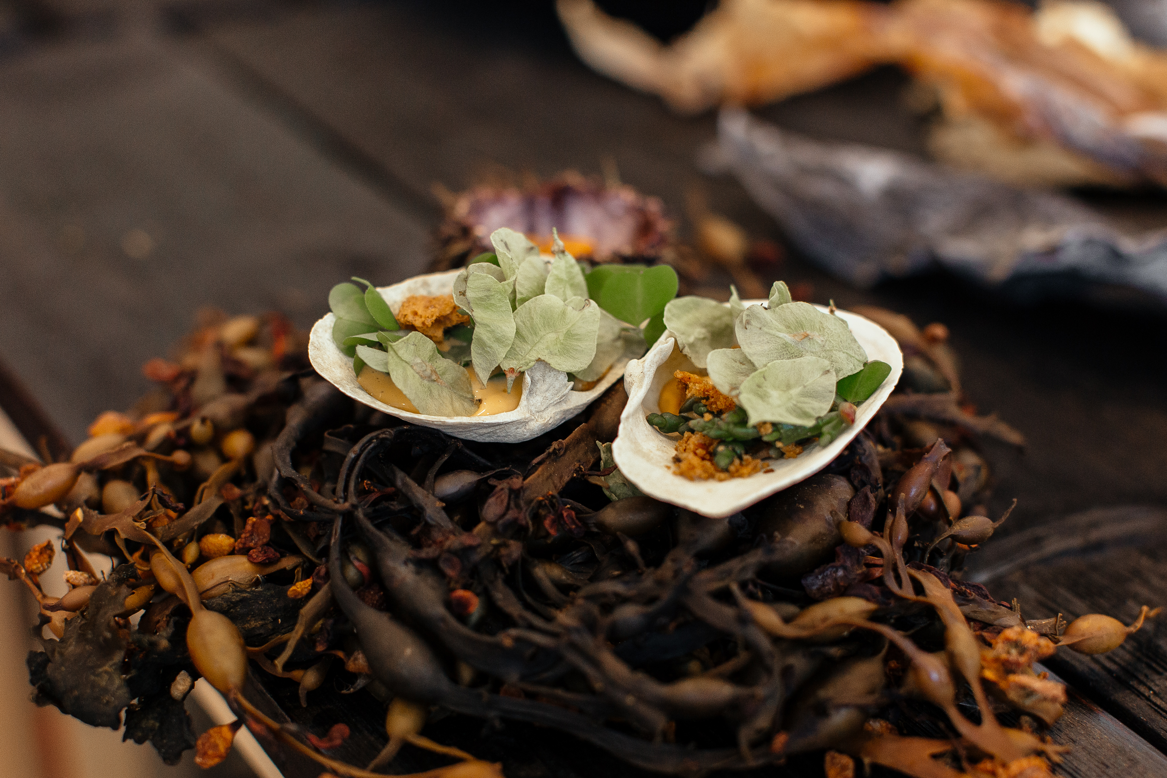 Syltet nesleblad, fritert reinlav, grannåler, salsa av einebær, krekling og syltet grankongle